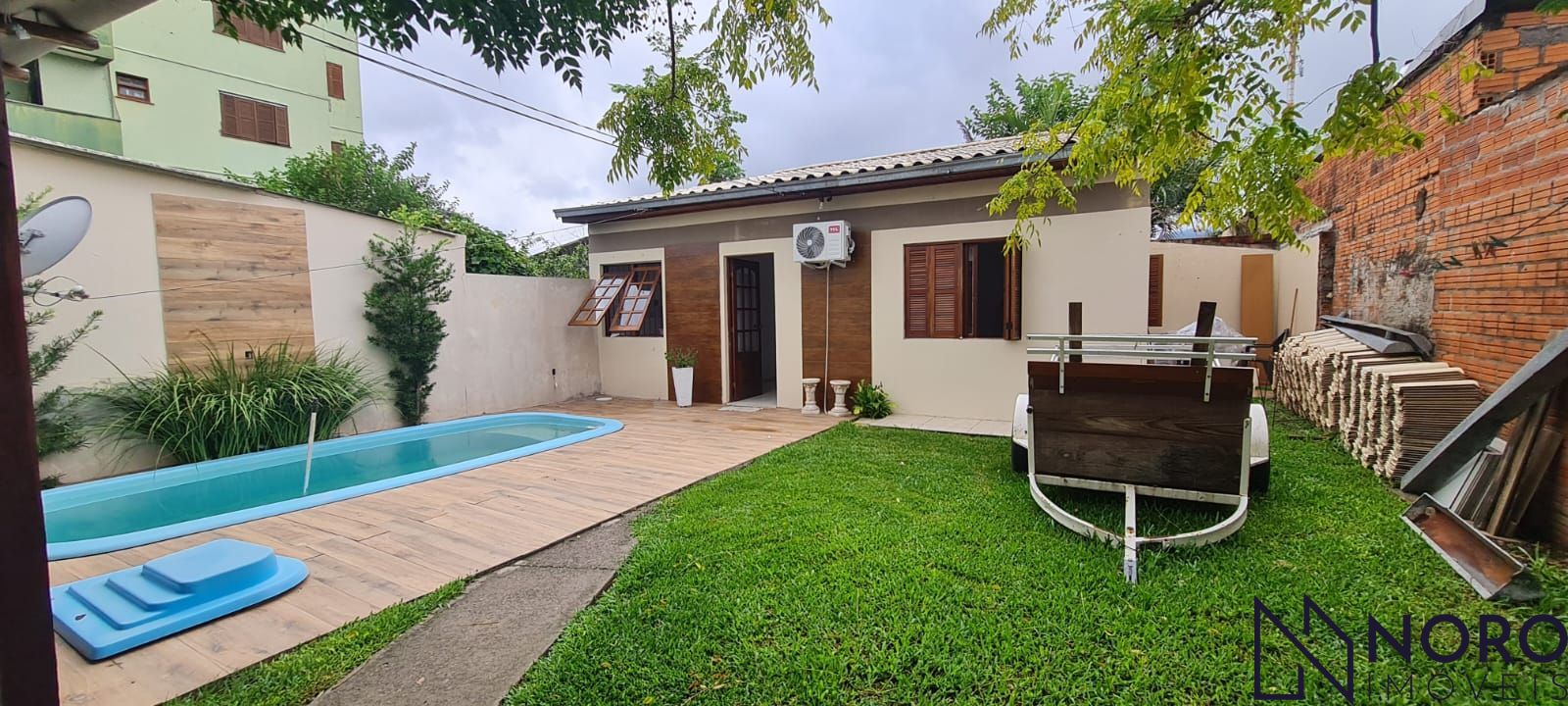 O espaço também dispõe de uma garagem coberta, integrada a uma churrasqueira, perfeita para momentos de lazer. O pátio possui uma piscina e um pequeno jardim com gramado, criando um ambiente agradável e aconchegante.