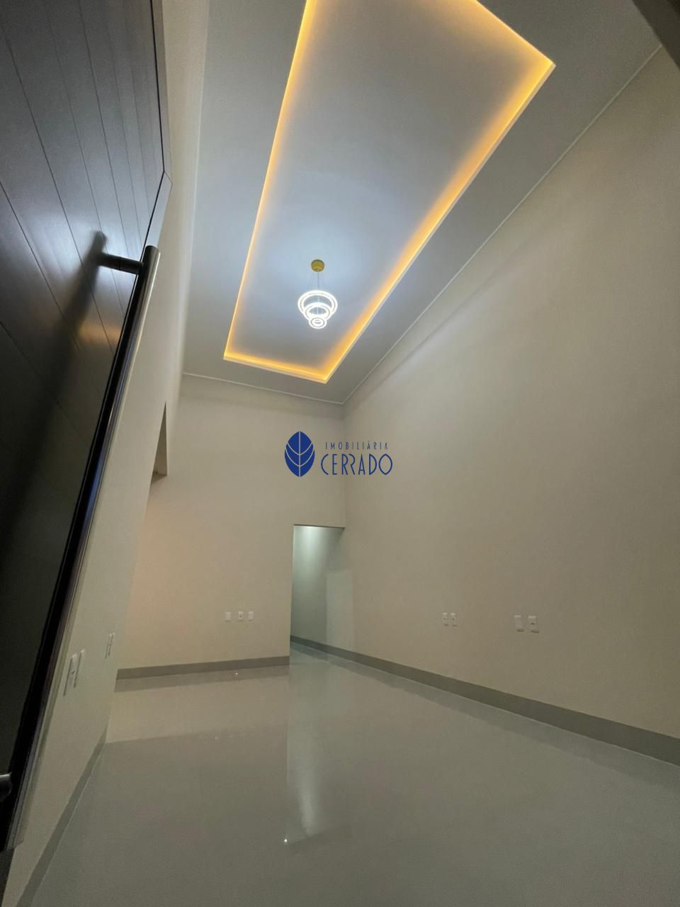 • Sala com pé-direito duplo de 5 metros, sanca em gesso, iluminação embutida e lustre