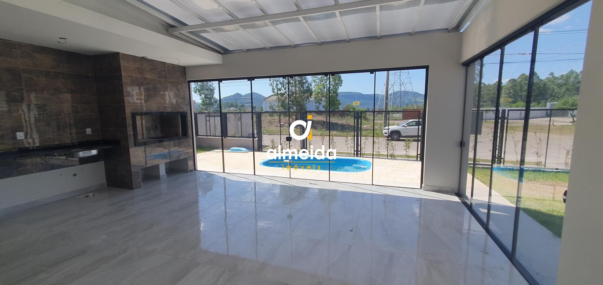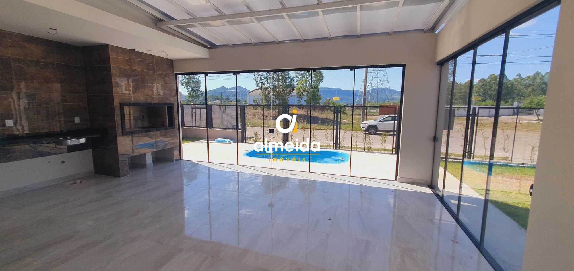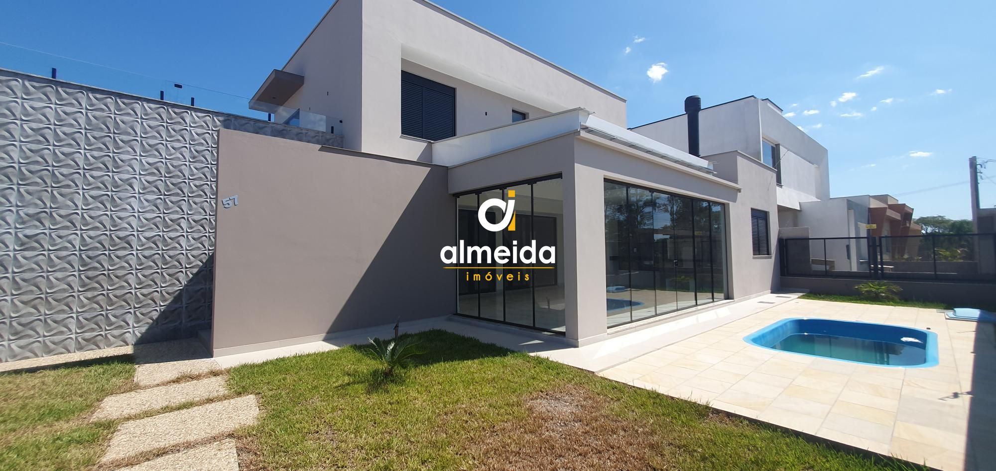 Sobrado com 3 suítes, cozinha, sala de estar/jantar, banheiro social, área gourmet com churrasqueira, terraço, pátio grande todo gramado e piscina. Garagem com duas vagas.