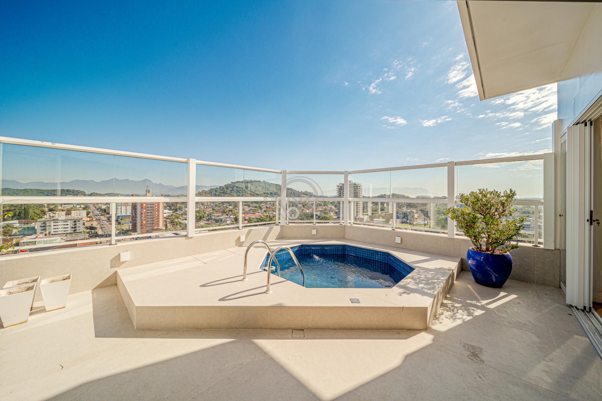 A área de lazer privativa da cobertura conta com uma agradável área de churrasqueira e uma piscina com deck, onde é possível se ter uma bela vista da Serra Dona Francisca. Além disso, a cobertura conta com 3 ótimas vagas de garagem individuais.