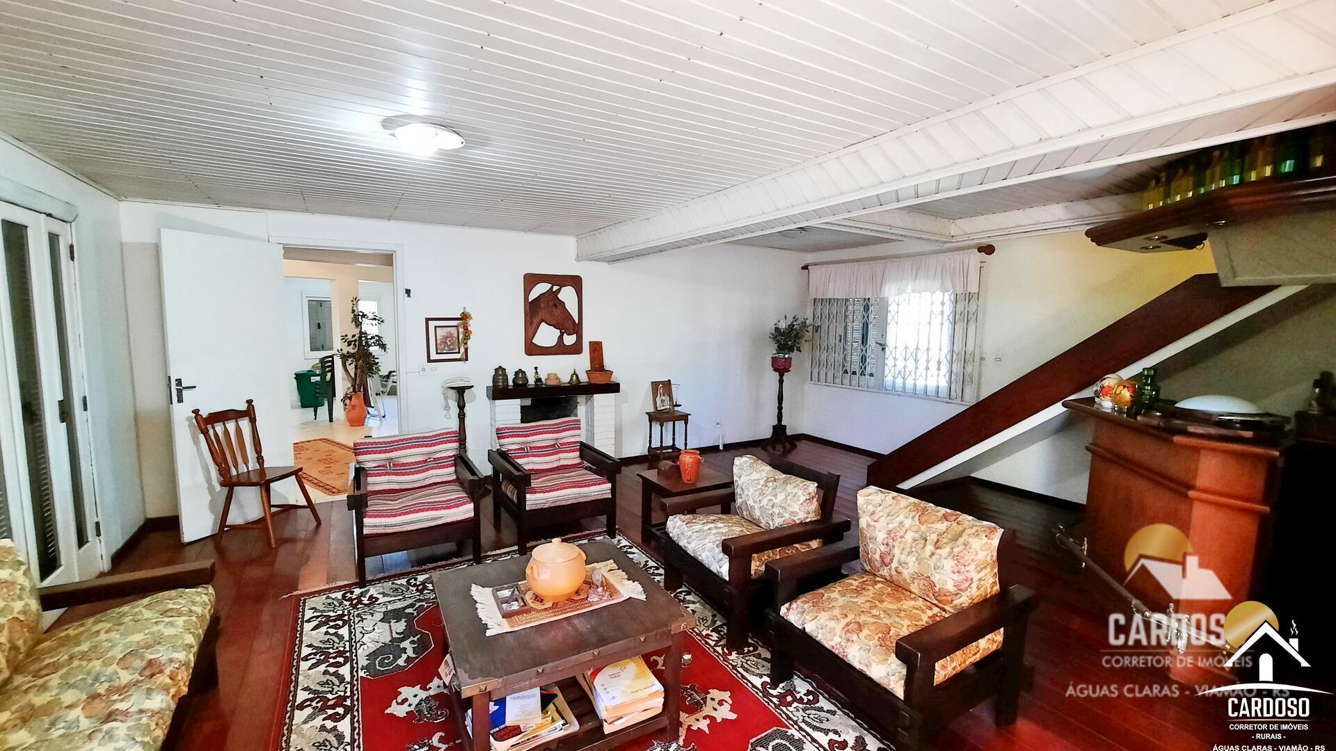 Sala estar de tabuão, com bar e lareira.