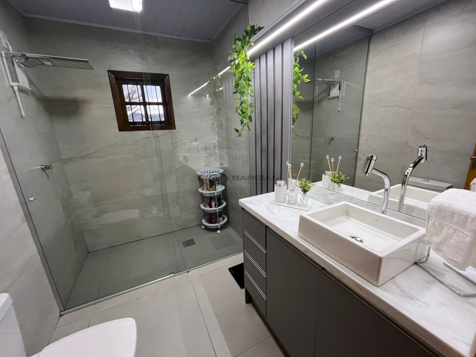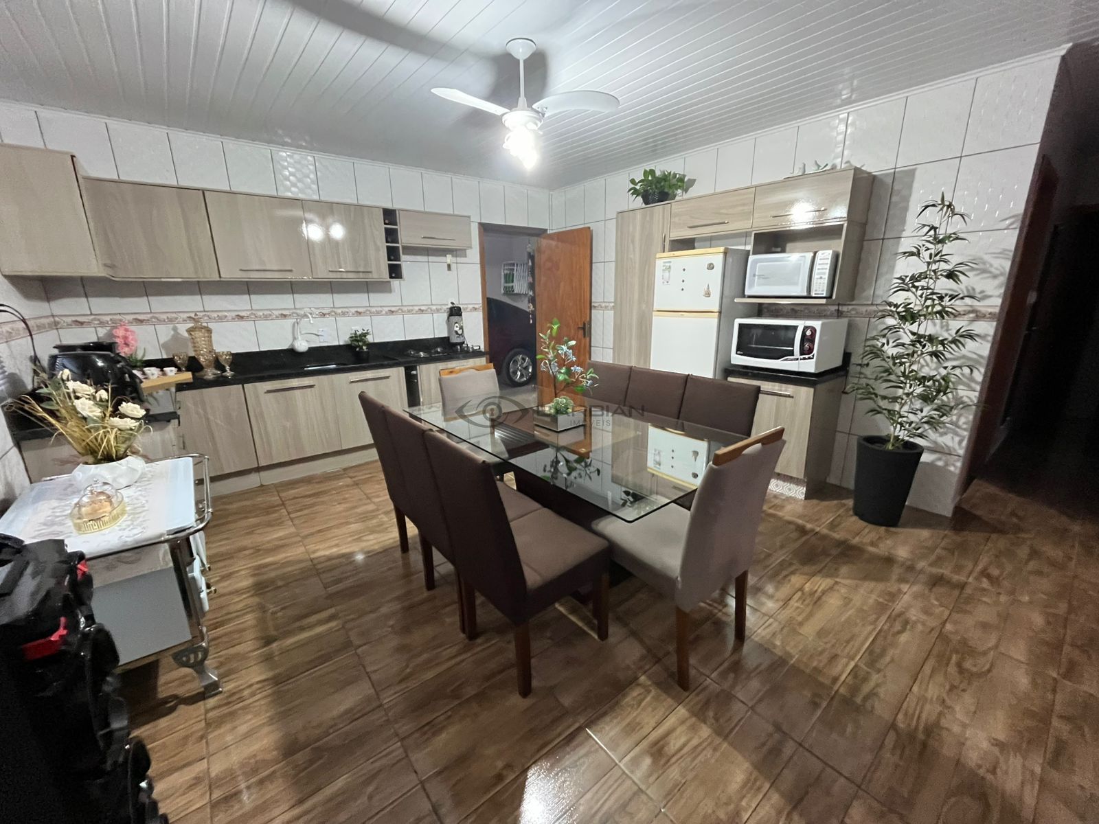 Garagem com churrasqueira, banheiro e lavanderia;