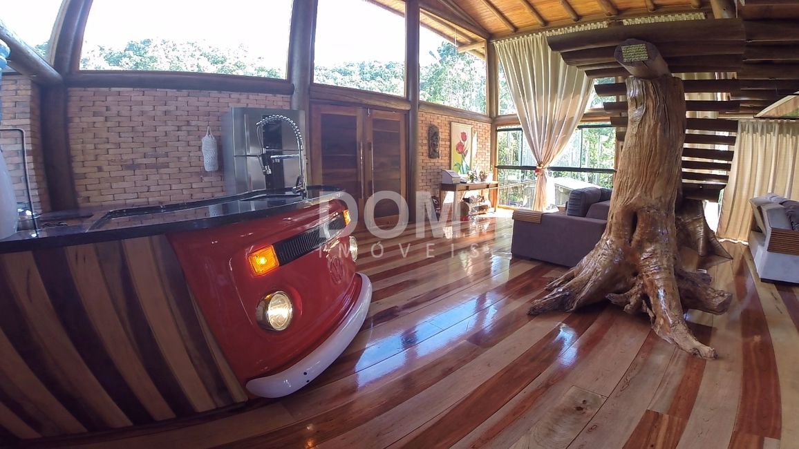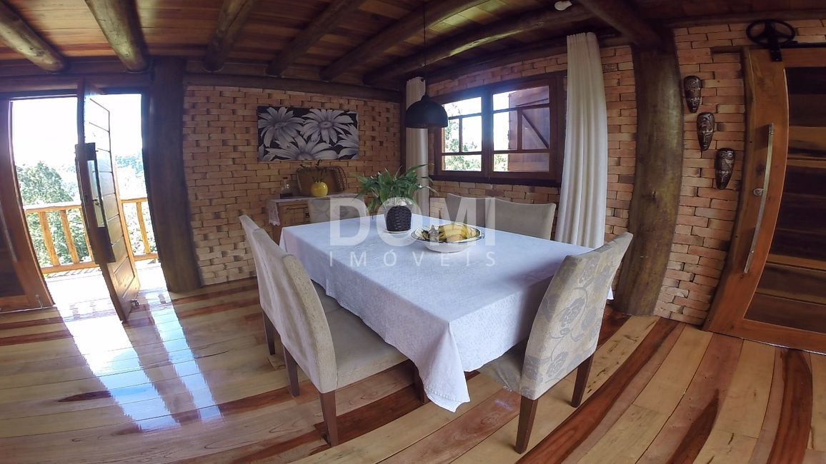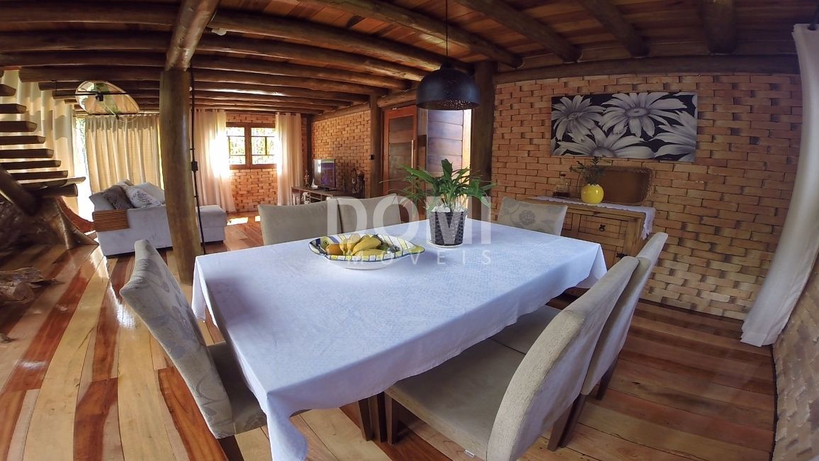 Casa rústica, com tronco de árvore para sustentar a escada, aberturas em madeira, portas duplas e grandes em madeira, tudo no mais fino acabamento.