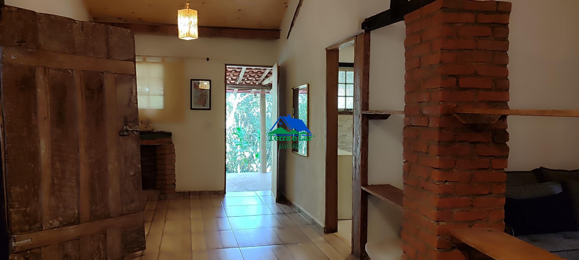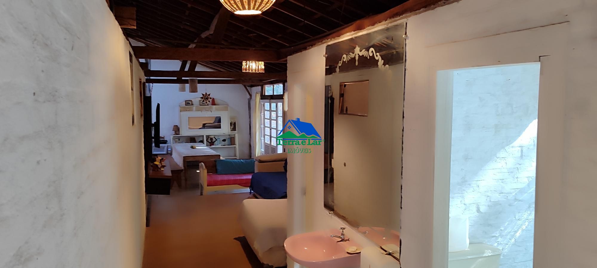 A casa principal, com uma área construída de 400m², oferece quatro suítes, além de dois banheiros sociais. O imóvel possui uma cozinha e uma sala de jantar. Também possui uma sala e uma varada.