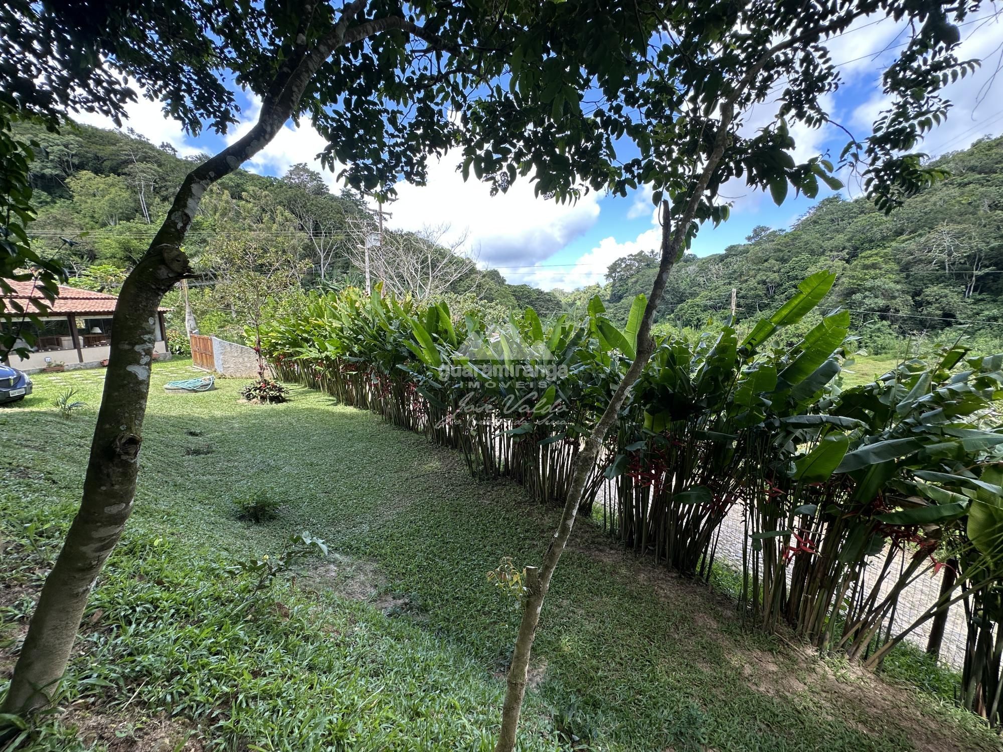 Area externa conta com jardim amplo, muita área plana, fruteiras e riacho.