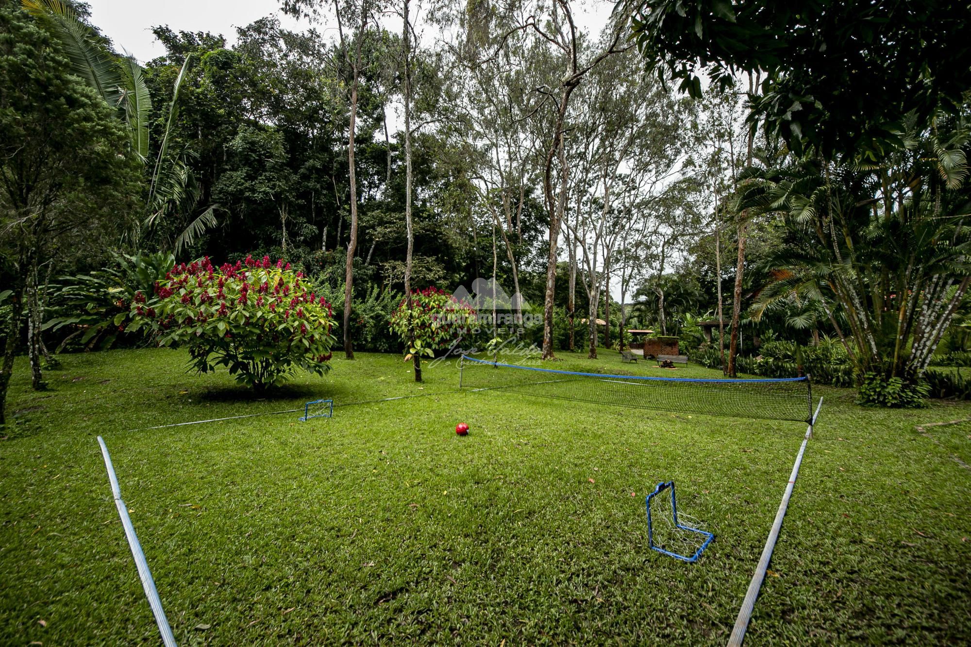 Area externa com amplo jardim plano com ampla área gramada, com campinho, pomar, horta e barragem.