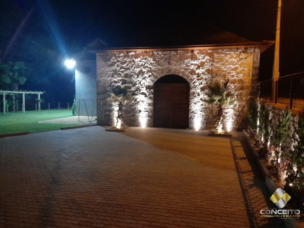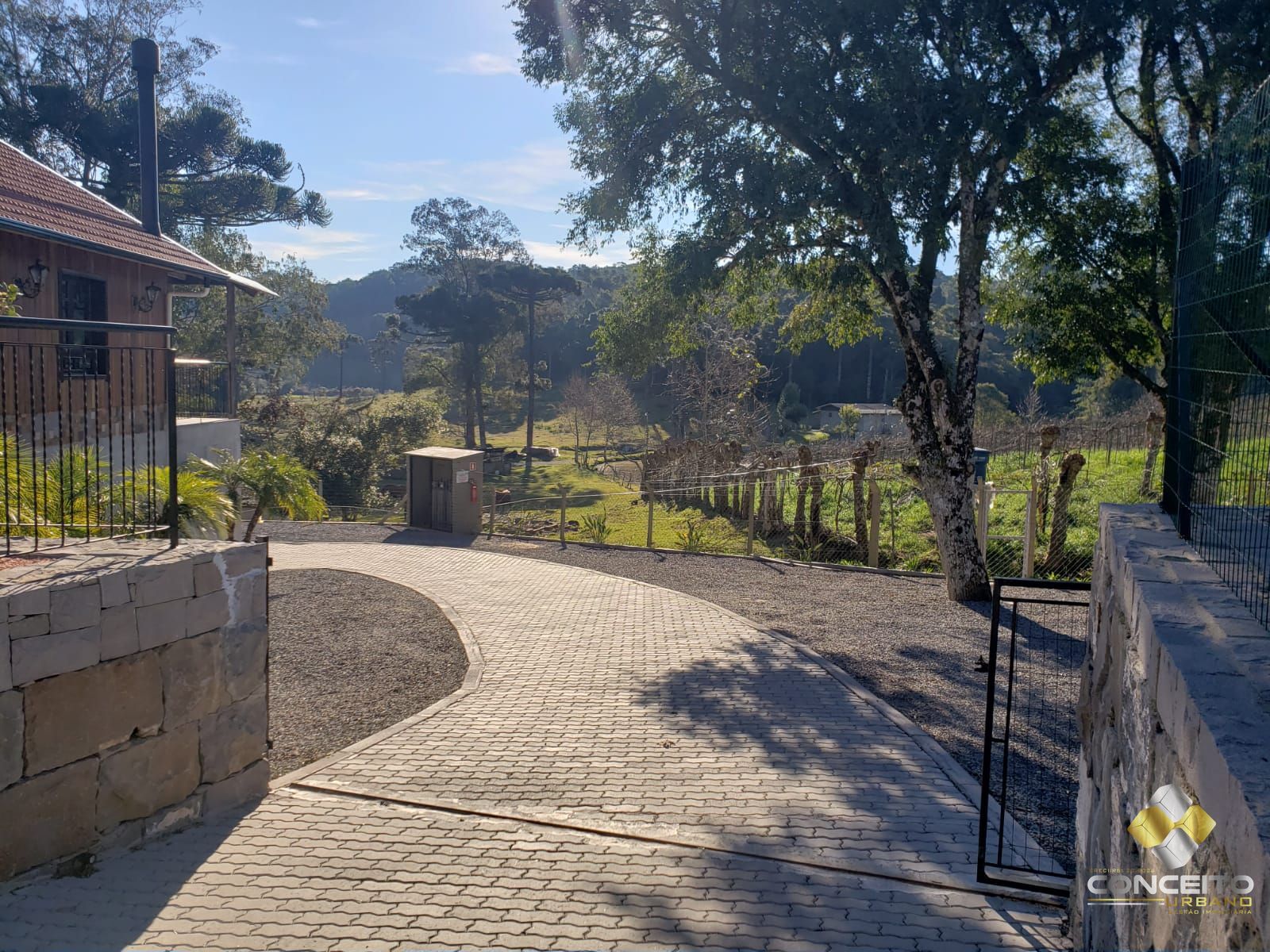 Possui um pergolado externo com grama, próximo ao riacho com vista para plantio de