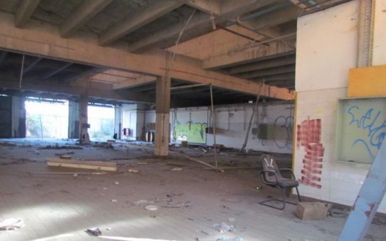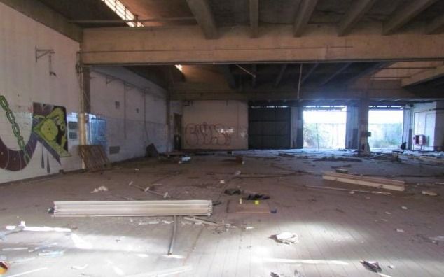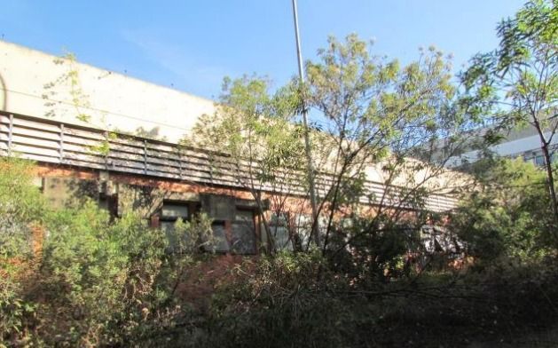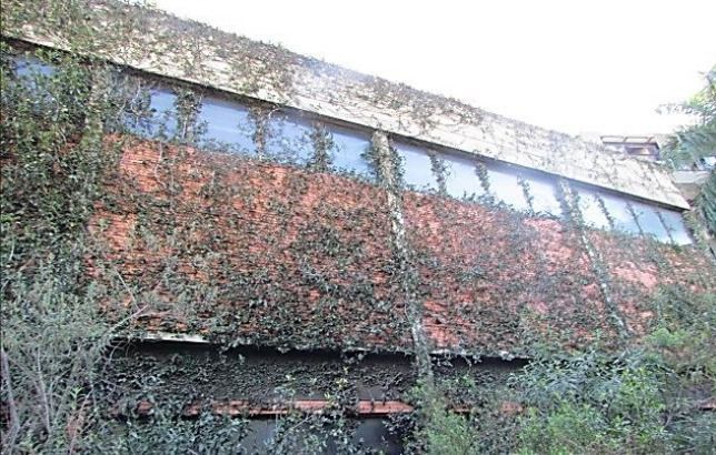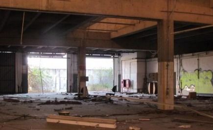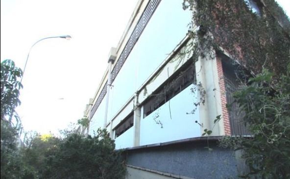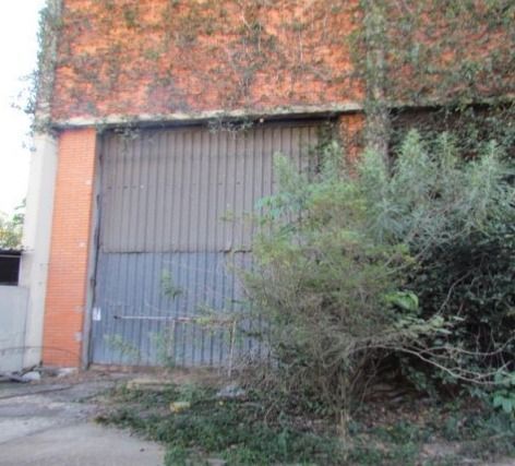 Galpão comercial A.U. 6.932,12 m² desocupado, com estrutura preservada e vegetação em estágio avançado.