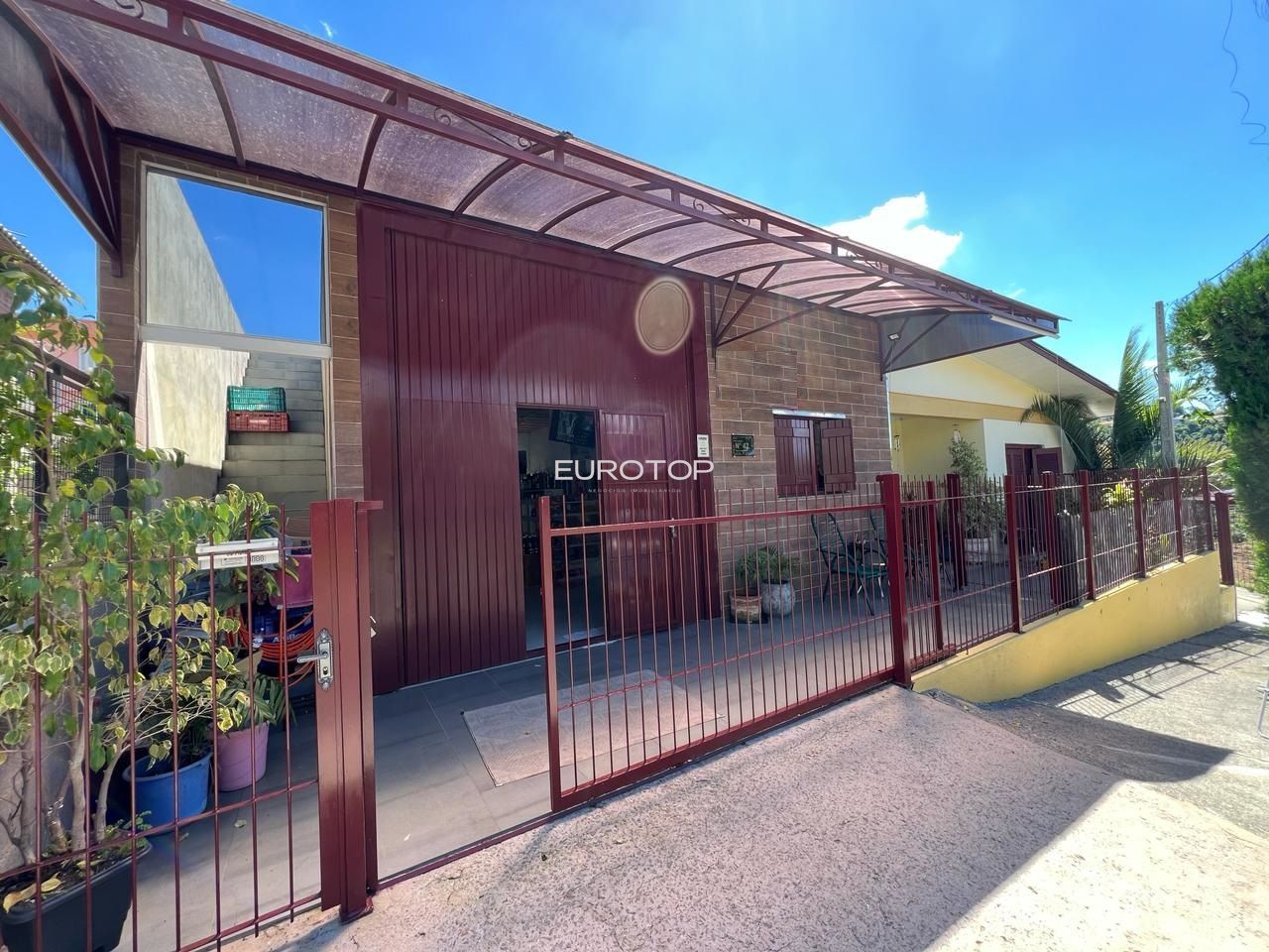 Eurotop vende casa em alvenaria e pavilhão comercial, sendo a casa com 97,33m², 2 dormitórios sendo 1 suíte, sala de estar, varanda, banheiro social, churrasqueira, sala de jantar, piscina e garagem para 2 carros lado a lado. O pavilhão possui 104,87m², pé direito alto, banheiro social e estrutura para construção de apartamentos no andar superior.