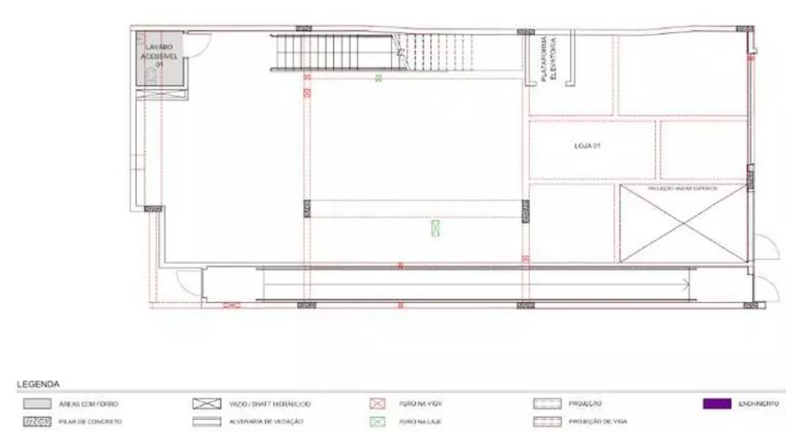 Térreo: Salão, 1 banheiro, elevador; Pavimento Superior: 2 (dois) depósitos, área técnica para ar-condicionado. Estacionamento com 6 vagas para automóveis, 1 vaga para PDC, 1 vaga para moto e 8 vagas para bicicletas, além de 2 vagas em frente a loja, sendo uma para utilitários.