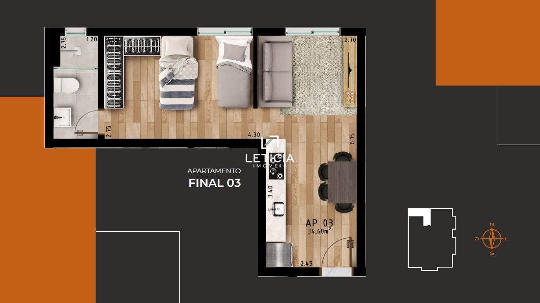 Studio com área privativa de 34 m², próximo à UFSM e dos principais pontos comerciais do bairro.