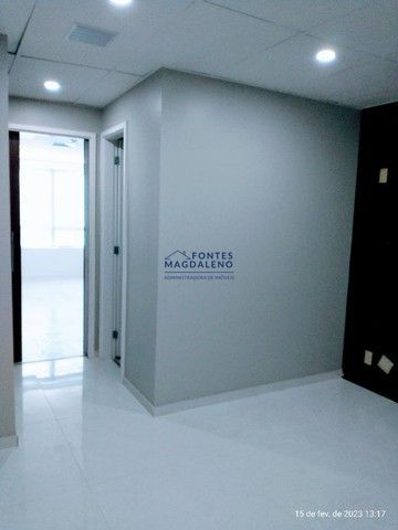 5° andar, 34m2, vazia, recepção em porcelanato branco, estantes e armários, som ambiente e ar condicionado instalados e funcionando, vaga coberta, documentos OK