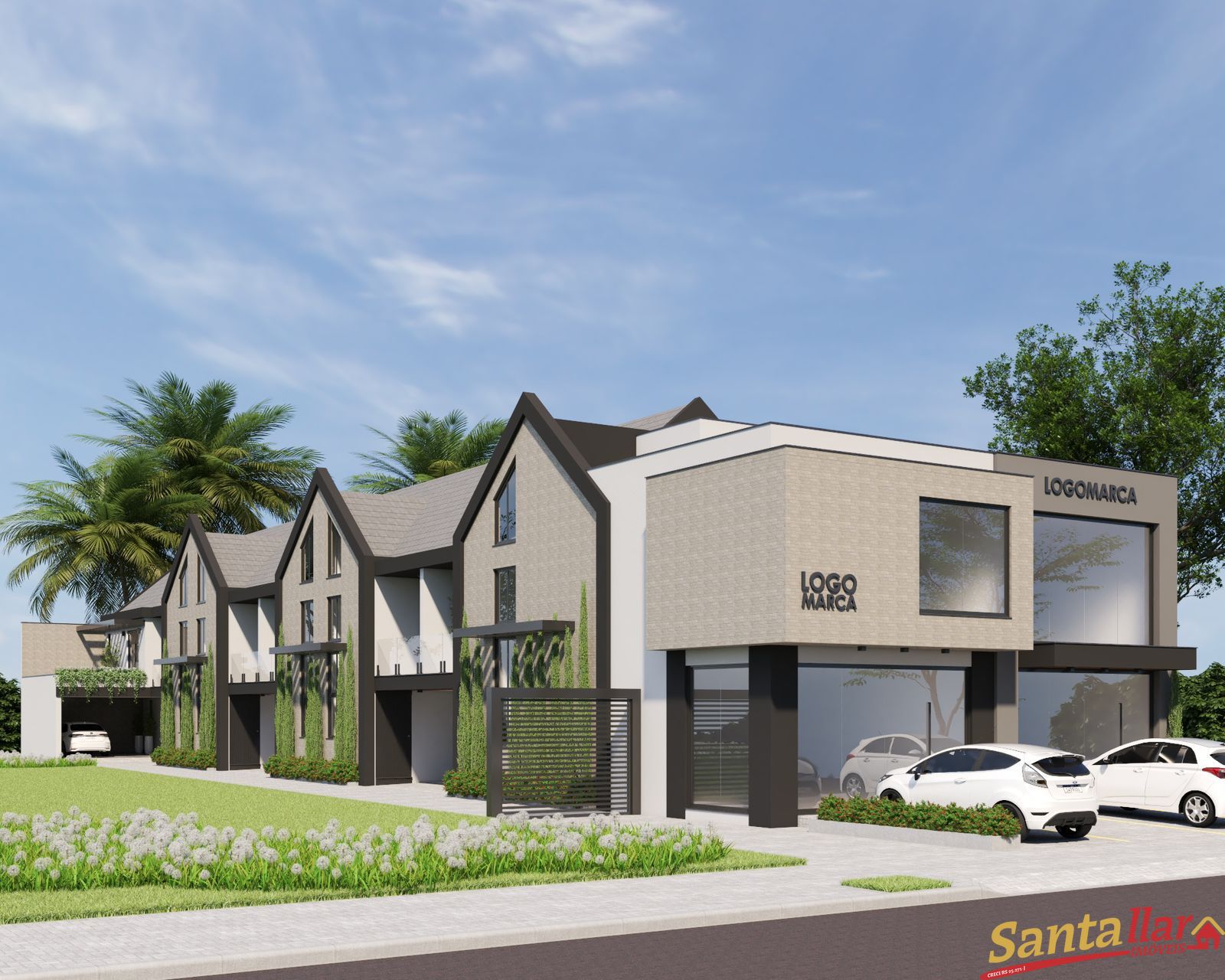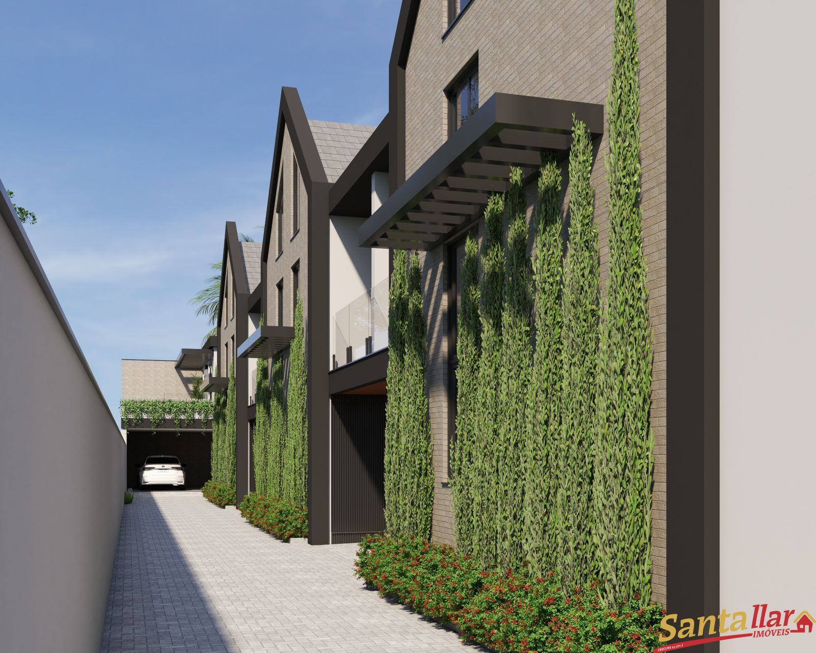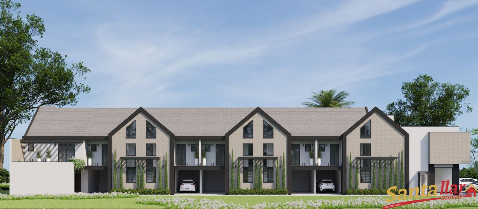 Os outros sobrados terão 2 suítes amplas com sacada no pavimento superior, hall de entrada com pé direito duplo, salas e cozinhas integradas, lavabo, lavanderia, sacada, pátio privativo e garagem coberta.