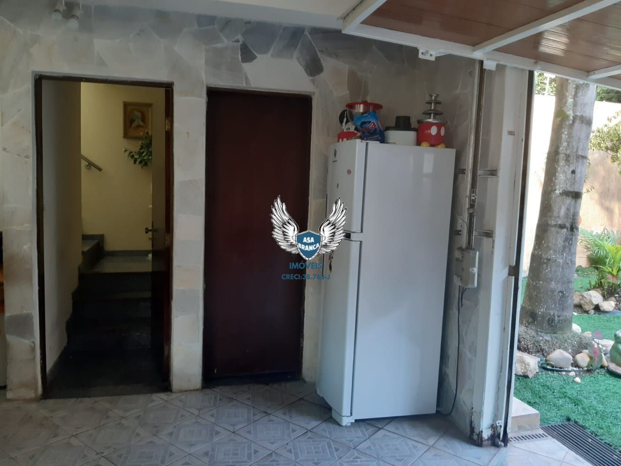 jardim com árvores, linda vista ,escada em ardósia, paredes da sala e cozinha revestidas de pedra mineira laminada.