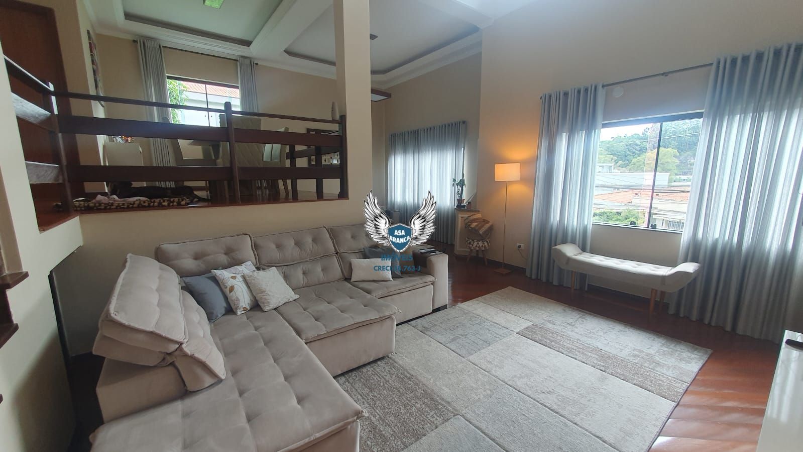 O pé-direito da casa tem mais de 8 metros de altura, com janela fixa grande que entrega iluminação natural e um estilo diferenciado.