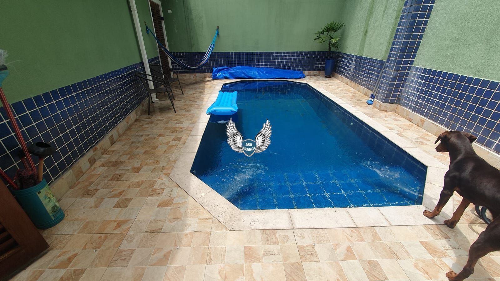 A área externa tem churrasqueira e piscina medindo 3x6 com bancos e jato de hidro, cascata, iluminação e aquecimento.