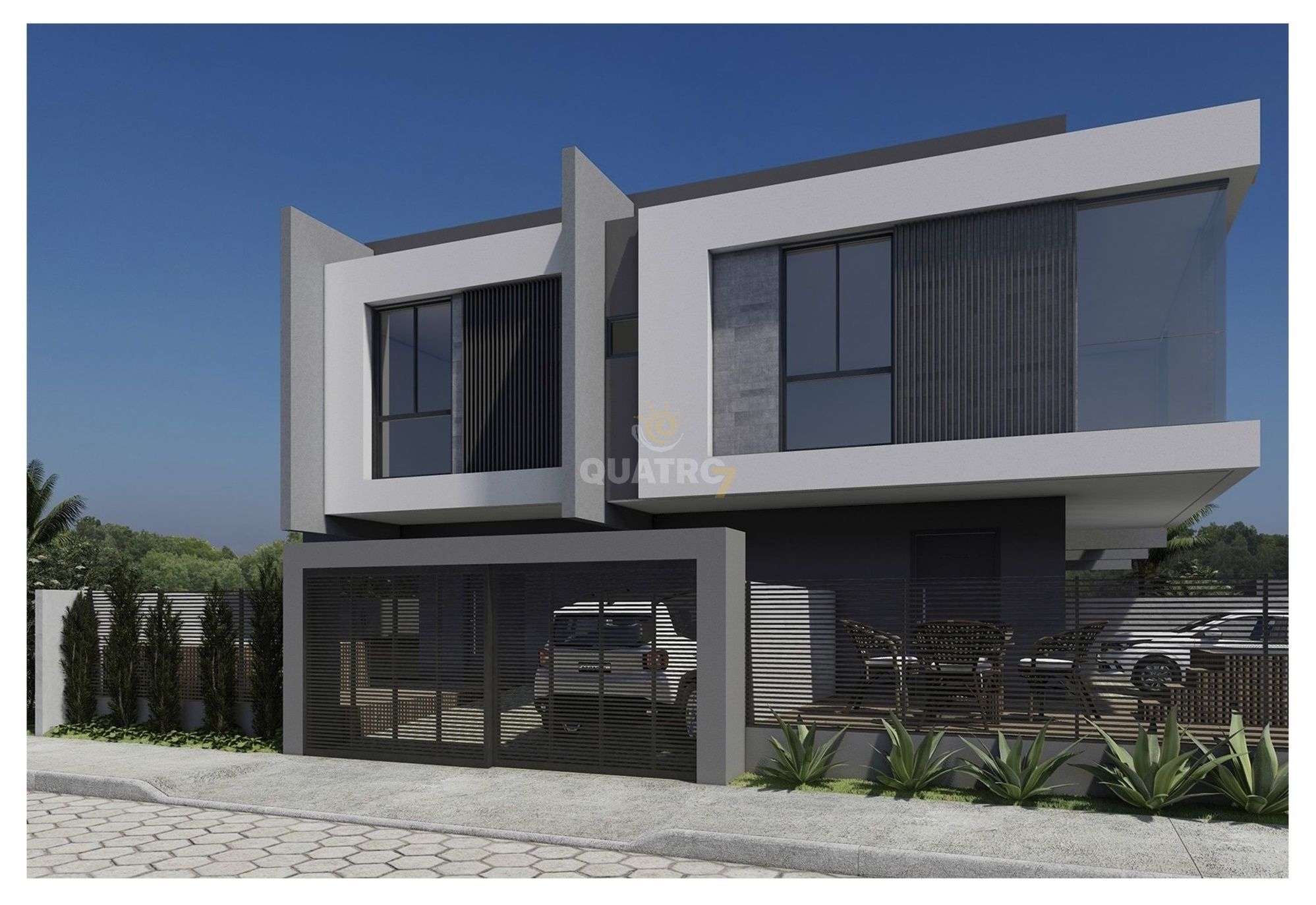85,54 m2 de área construída, sendo 2 suítes, varanda superior, sala e cozinha integradas, lavanderia, lavabo, 2 vagas de garagem, área externa.