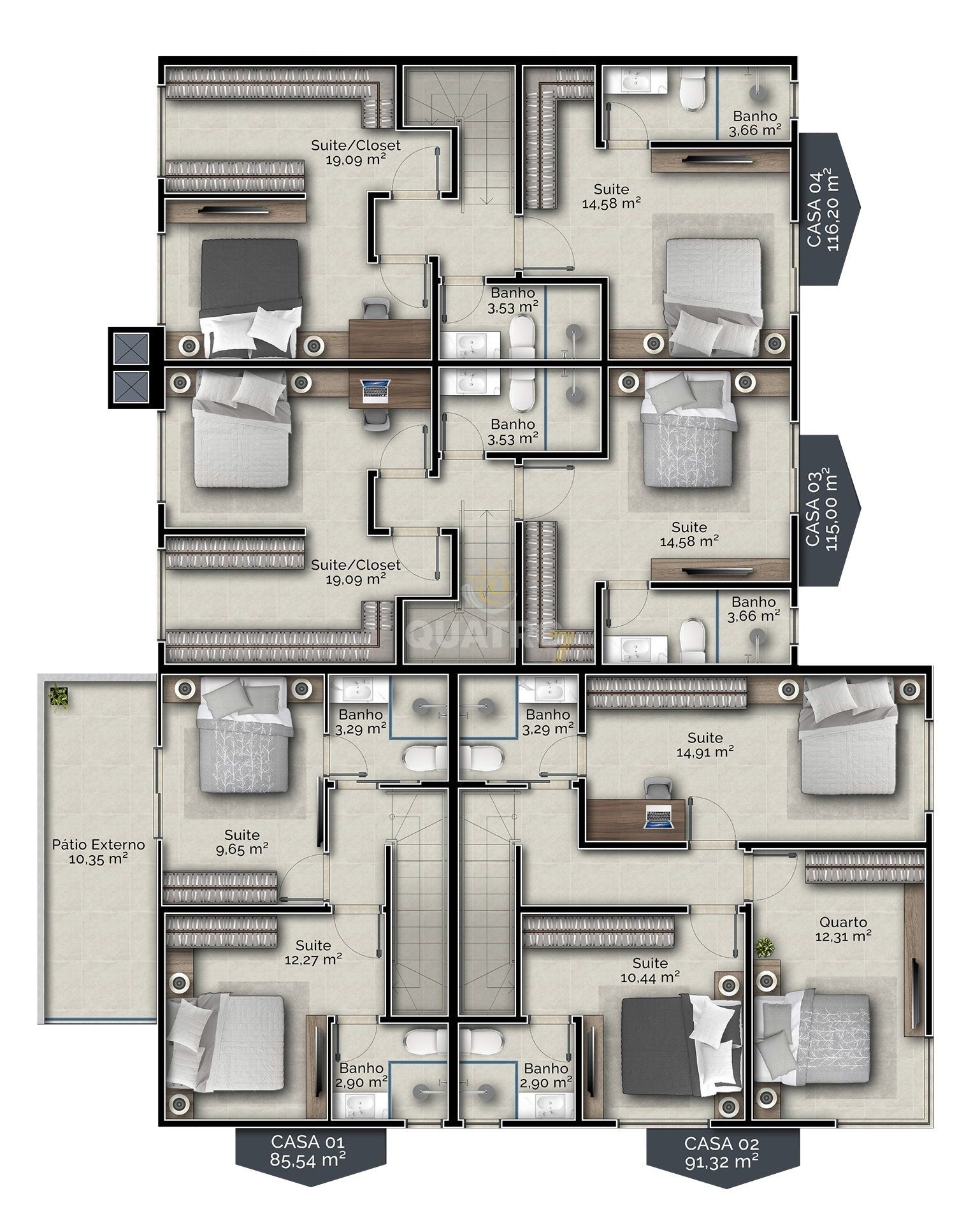 115,00 m2 de área construída, 2 suítes, 1 closet/quarto solteiro, sala, cozinha, lavabo, lavanderia, pátio externo com churrasqueira, 1 garagem coberta + 1 vaga.