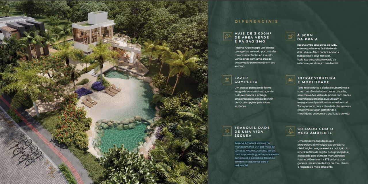 Sinta que sua nova vida é aqui Para uma vida mais leve, tranquila, próxima ao verde e ao mar. Reserva Arbo entrega toda facilidade de uma uma região em pleno desenvolvimento, aliada a um projeto único, seguro e abraçado por uma reserva permanente de vegetação, sendo pioneiro na entrega de uma área com lago natural integrado a vida aquática, tecnologia e paisagismo. M A I S D E 3 .0 0 0 M 2 D E Á R E A VE R D E E PA I S A G I S M O Reserva Arbo integra um projeto paisagístico assinado por uma das maiores referências no assunto. Conta ainda com uma área de preservação permanente em seu entorno . A Z E R COMPL E TO Um espaço pensado de forma integrada com a natureza, onde tudo se conecta e entrega ambientes para prática de viver bem, com opções para todas as idades. A 900 METROS DA PRAIA Reserva Arbo está perto de tudo, entre as praias e as facilidades da vida urbana. Além de fácil acesso a toda região e seus atrativos. Tudo isso cercado pelo verde da natureza que abraça o residencial. T R A N Q U I L I DA D E D E U M A V I DA S EGURA Reserva Arbo terá sistema de monitoramento 24h por meio de câmeras. A estrutura conta ainda com imponente guarita para acesso de veículos e pedestres, trazendo controle e segurança para o residencial.
