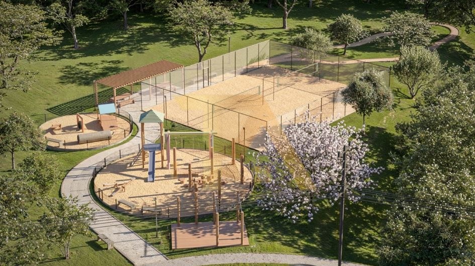Área de lazer com playground, pet place e quadra de beach tennis